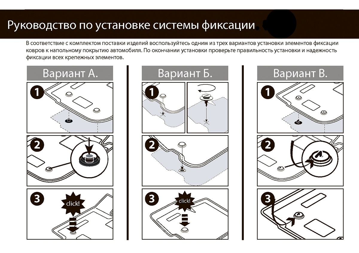 | Крепление | Крепеж в комплекте. Фиксаторы к коврикам: передний левый - 2; передний правый - 1 |