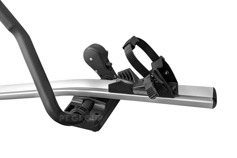 Велокрепление на поперечины багажника легко устанавливается на дуги практически всех типов. Прямоугольного сечения, аэродинамические и крыловидные. Зажим для рамы велосипеда снабжен замком и надёжно удерживает её при движении. Максимальное сечение рамы велосипеда до 90 мм.